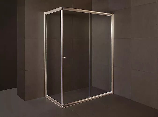Semi-frameless shower enclosure for rectangular shower trays, with one fixed panel and one sliding door entry facade, and one fixed side panel. Manufactured with reinforced aluminium profiles and 6 mm tempered glass.