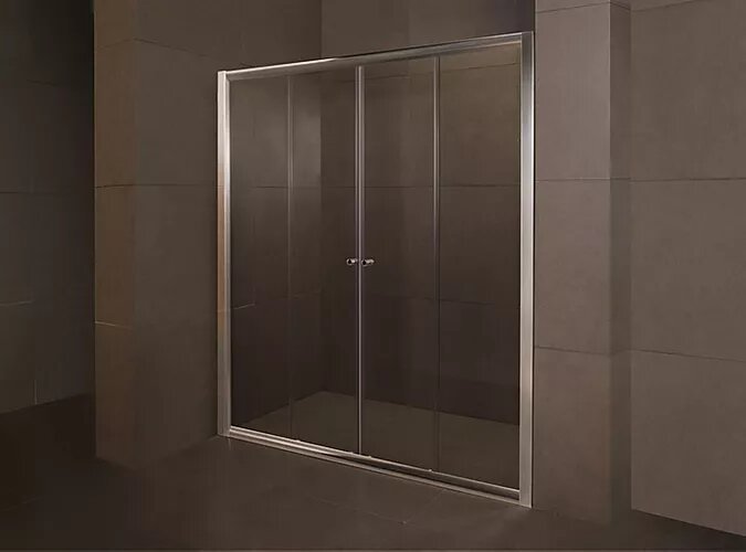 Semi-frameless shower enclosure for wall-to-wall shower trays, with two fixed panels and two sliding doors entry. Manufactured with reinforced aluminium profiles and 6 mm tempered glass.